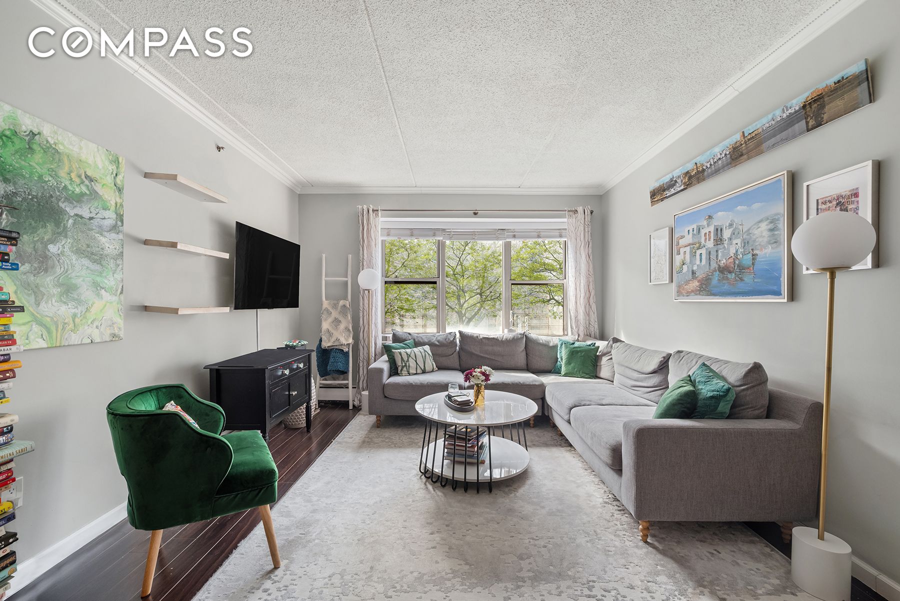The large south-facing living room is bright and inviting and easily accommodates both a living and dining setup, making it perfect for relaxing or entertaining.