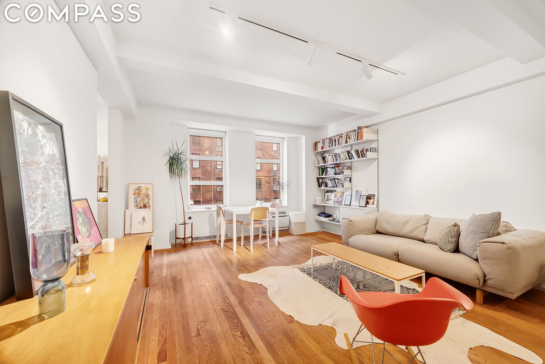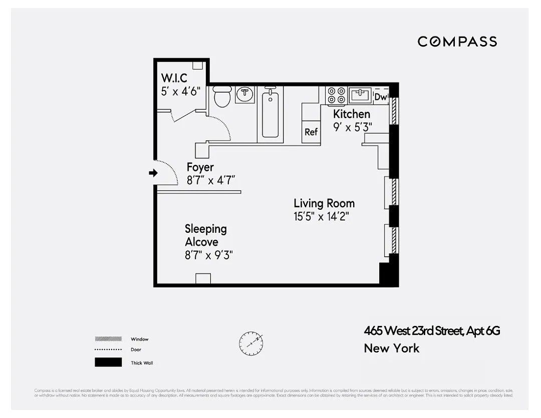 The large living room features two oversized windows and space for a large couch, a home office setup, and a dining table. The alcove can comfortably fit a queen-sized bed, and a dresser. The bathroom highlights white Anne Sacks tiles, Duravit vanity, Waterworks fixtures, and a tub. There's also a large walk-in closet and a brand-new through-wall A/C unit.